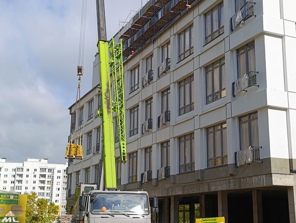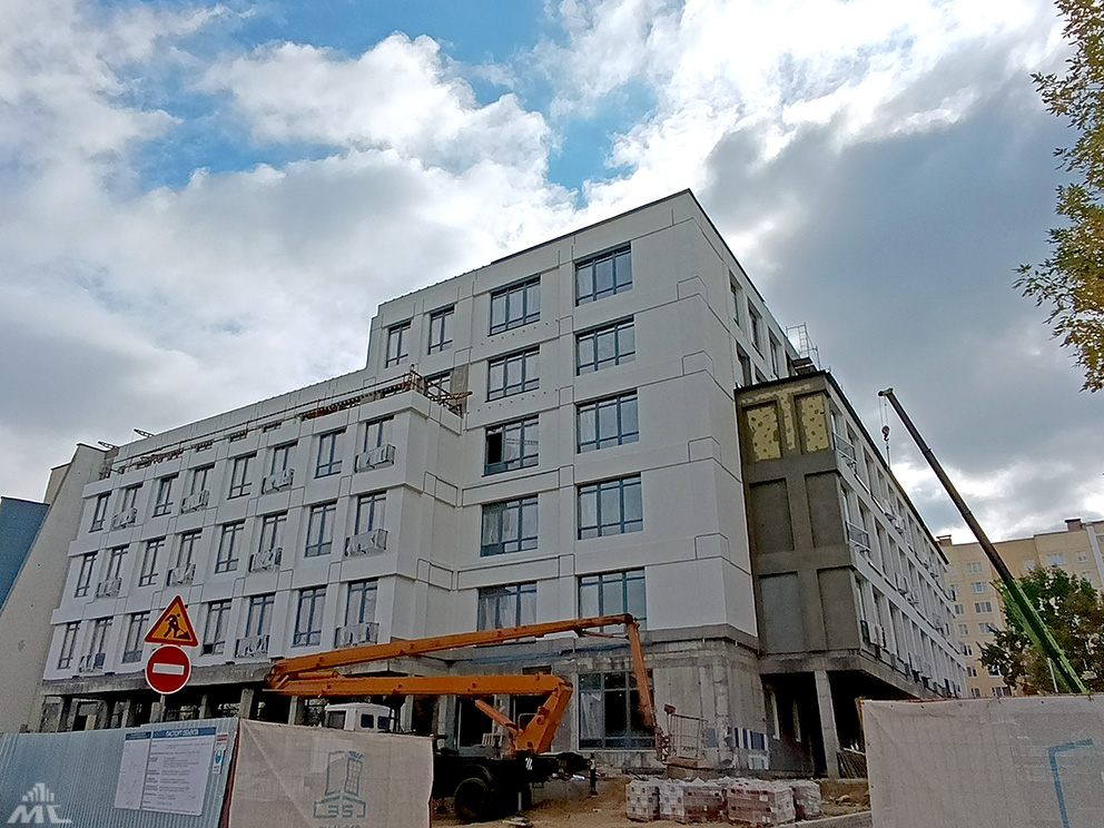 Уже практически готова кровля – сейчас работы ведутся на участках, где она будет эксплуатируемой. На лестничных маршах устанавливаются витражные системы, ведётся облицовка бессером крылец.