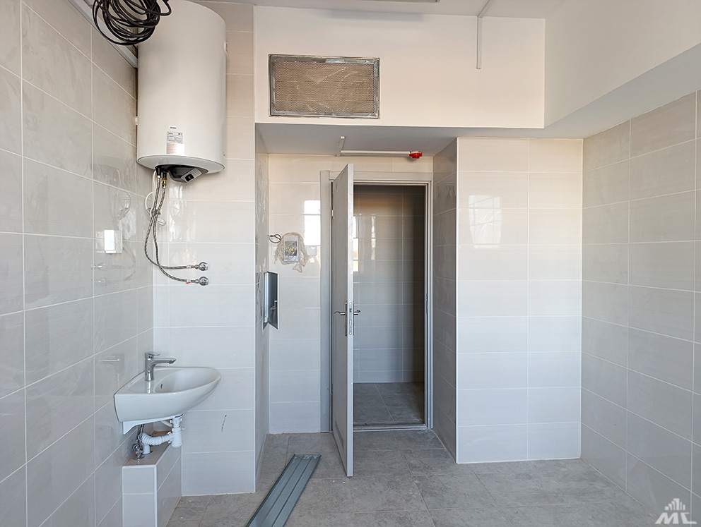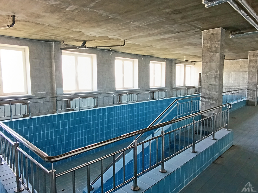 Перед сдачей строители ускорились: работают по продленным дням и субботам. Задействовано порядка 120 человек, в основном отделочники СУ-211, электромонтажники УСР и сантехники МСУ. Все лифты уже смонтированы (поликлиника семиэтажная), выполнены потолки Армстронг, доукладывается плитка, устанавливается сантехпосуда, шлифуется паркет. Помещения и коридоры шпатлюются и красятся: маляры придают им эстетику. Уже готов бассейн, кстати, он имеет дополнительный вход с улицы.