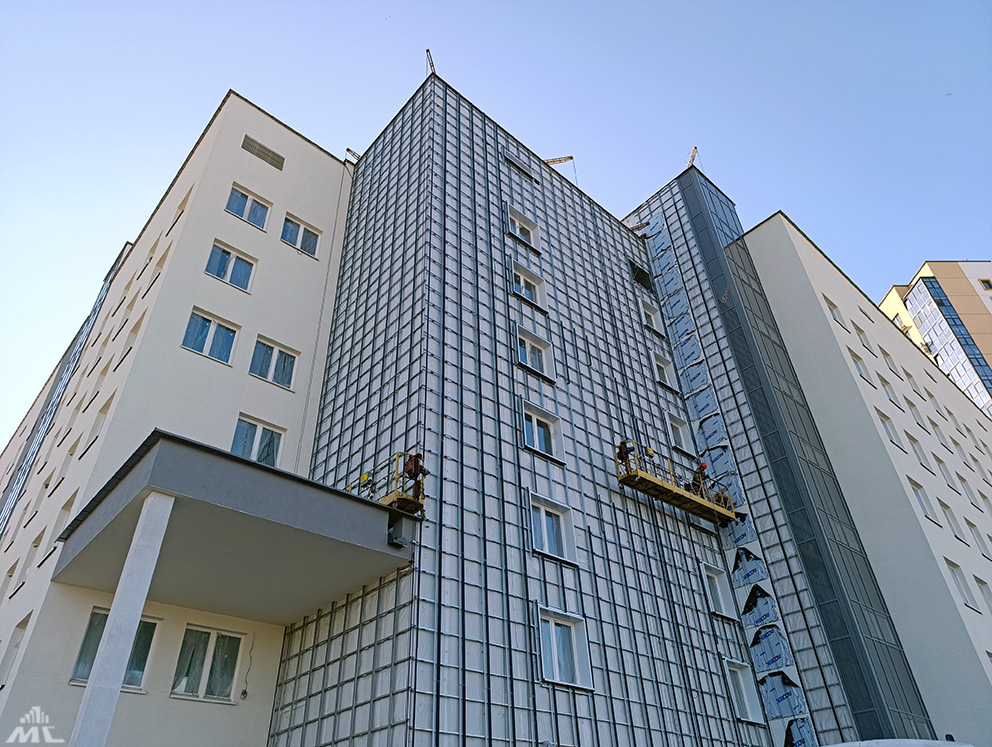 Законченный вид обретает также фасад. На объект поставлены фасадные панели из алюмокомпозита, и фасадчики приступили к их монтажу со стороны центрального входа.